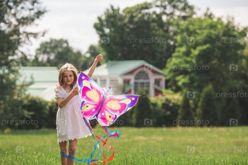 Дети в летнем парке. Красивая девушка летает на воздушном змее. Теплые семейные моменты или концептуальный образ для проведения времени на открытом воздухе