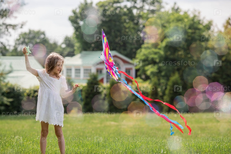 Дети в летнем парке. Красивая девушка летает на воздушном змее. Теплые семейные моменты или концептуальный образ для проведения времени на открытом воздухе