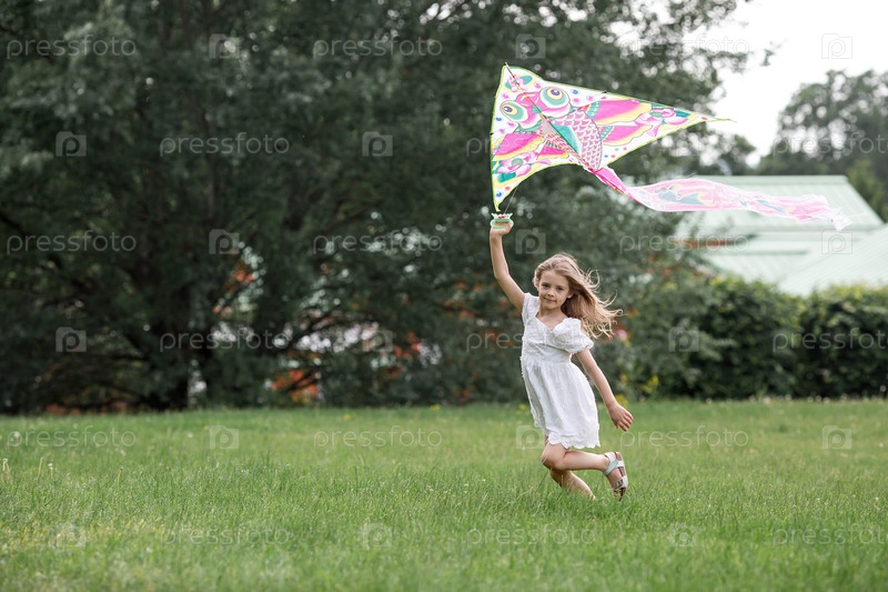 Дети в летнем парке. Красивая девушка летает на воздушном змее. Теплые семейные моменты или концептуальный образ для проведения времени на открытом воздухе