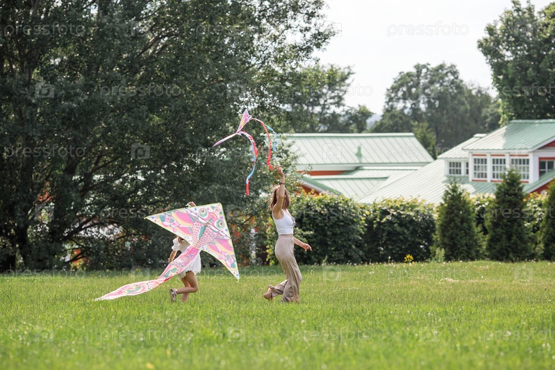 Дети в летнем парке. Красивая девушка и ее мать летают на воздушном змее. Теплые семейные моменты или концептуальный образ для проведения времени на открытом воздухе