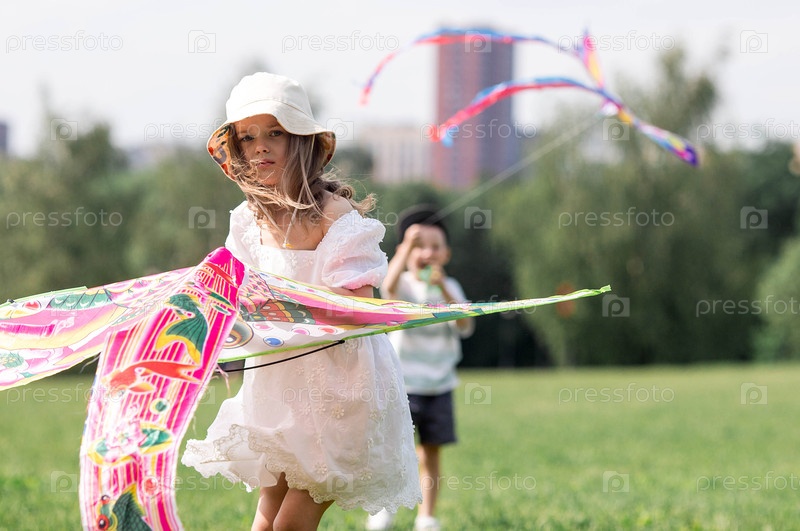 Дети в летнем парке. Дети гуляют и летают на воздушном змее. Теплые семейные моменты или концептуальный образ для проведения времени на открытом воздухе
