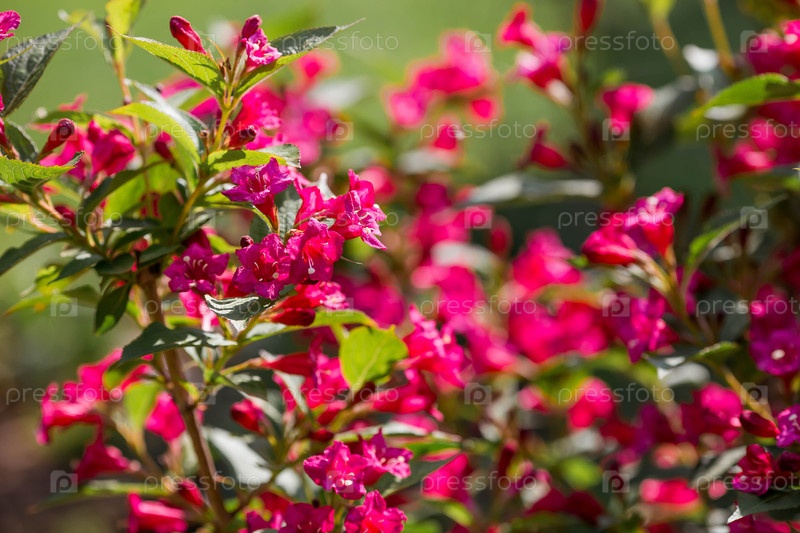 Розовая вейгела цветет крупным планом. Яркие розовые кустарники цветущей вейгелы летом. Большие цветы и почки на зеленом фоне