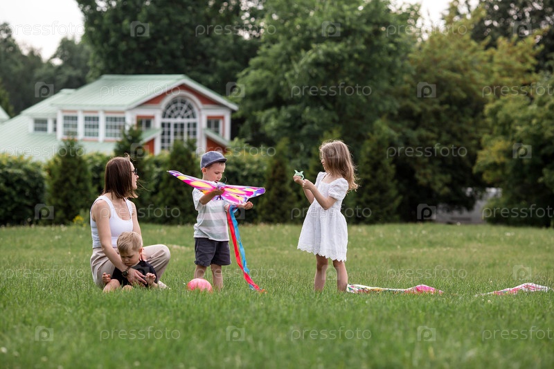 Семья с тремя детьми. Мать с большим количеством детей и малышей в летнем парке. Дети гуляют и летают на змее. Многодетные семьи, семейные ценности, досуг с детьми