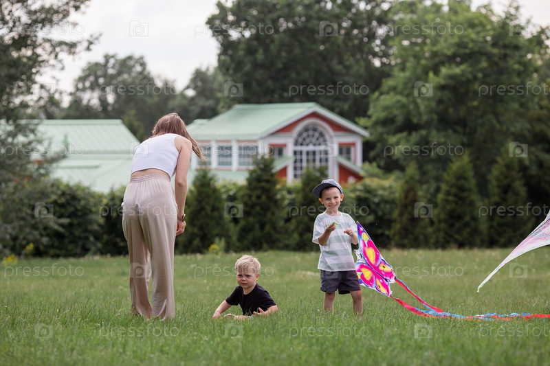 Семья с тремя детьми. Мать с большим количеством детей и малышей в летнем парке. Дети гуляют и летают на змее. Многодетные семьи, семейные ценности, досуг с детьми