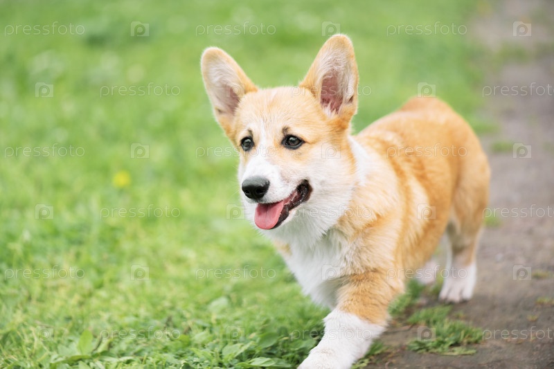 Pembroke Welsh Corgi with its tongue out walking along a trail, close up Пемброук валлийский корги с выдвинутым языком идет по тропинке, крупный план, место для текста