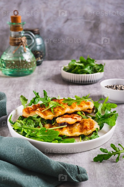 Теплый салат с жареными халуми и аругулой на тарелке на столе с вертикальным видом