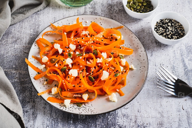 Домашние ломтики моркови в специях с рикоттой и семенами тыквы на тарелке
