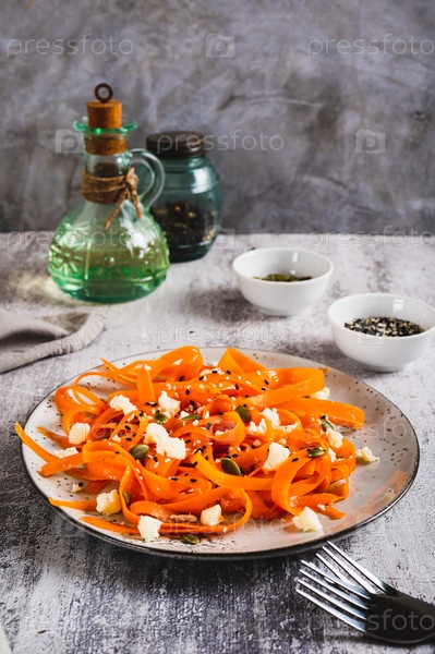 Острая морковь, рикотта и салат из семян тыквы на тарелке на столе вертикальный вид