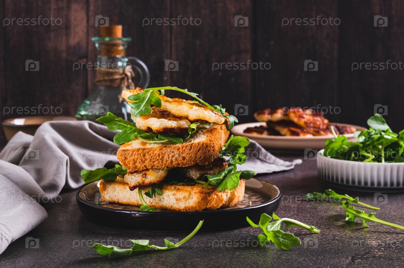 Вкусный сэндвич с жареными халуми и аругулой на тарелке на столе