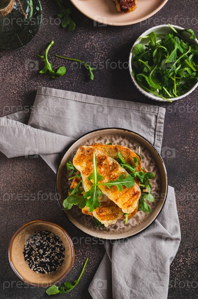 Жареный бутерброд Halloumi и Arugula на тарелке на столе и с вертикальным видом