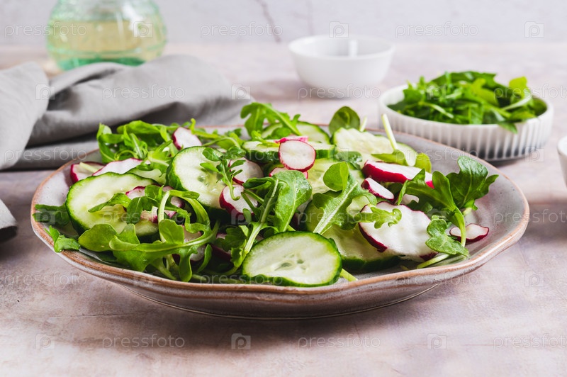 Вегетарианский салат с огурцом, редькой и аругулой на тарелке на столе