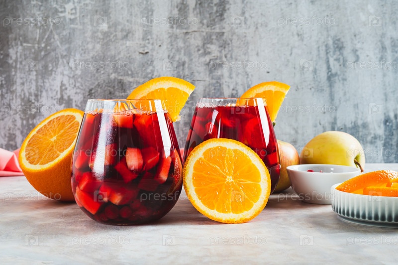 Освежающий летний коктейль из сангрии с фруктами и ягодами в стаканах на столе