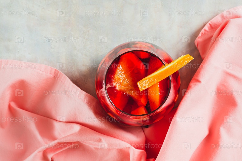 Закройте освежающий летний коктейль из сангрии с фруктами и ягодами в стеклянном виде сверху