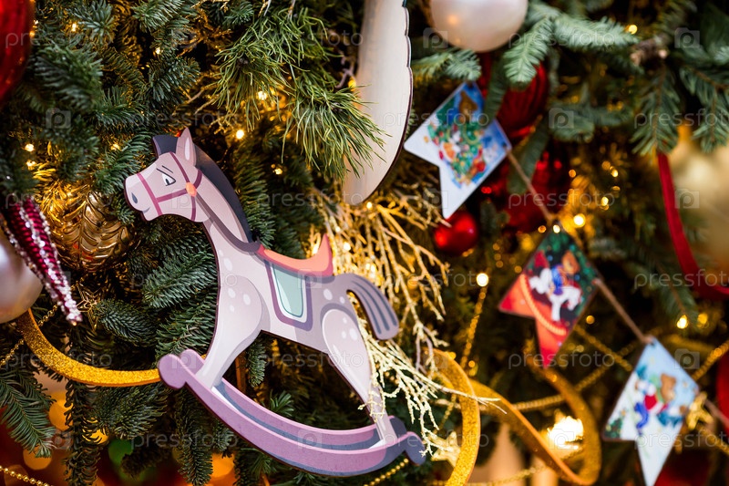 Праздничные игрушки на елке на улицах Москвы. Новогодняя открытка 2026. Прекрасный рождественский фон. Концепция подготовки декораций и декораций к новому году