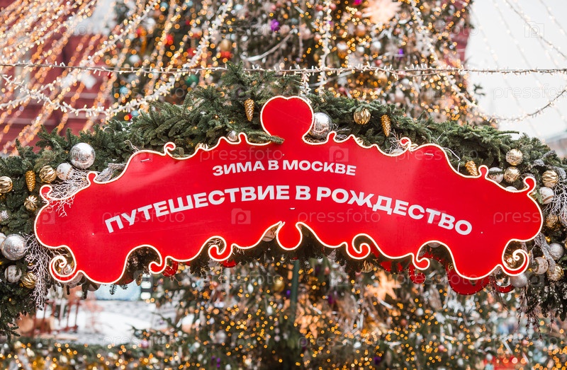 Новый год. Рождественские украшения на улицах Москвы. Новогодняя ярмарка на Красной площади. Надпись на красной доске на русском языке: «Зима в Москве. Путешествие на Рождество"