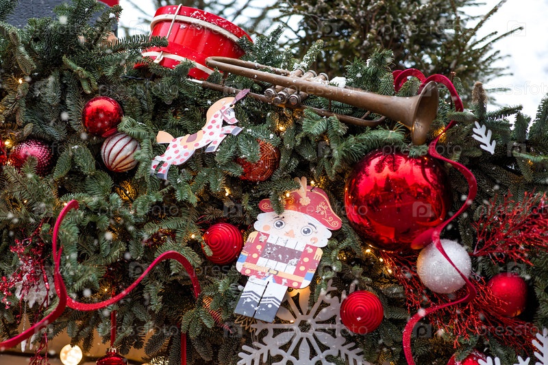 Праздничные игрушки и петушка на рождественской елке в Москве. Новогодняя открытка 2026. Прекрасный рождественский фон. Концепция подготовки декораций и декораций к новому году