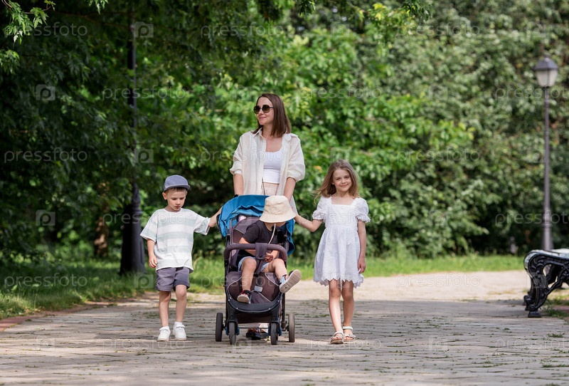 Семья с тремя детьми. Мать с большим количеством детей и малышей в летнем парке. Дети гуляют на свежем воздухе. Многодетность и семейные ценности
