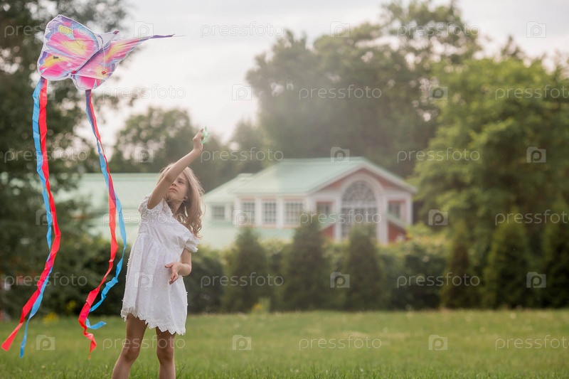 Дети в летнем парке. Красивая девушка летает на воздушном змее. Теплые семейные моменты или концептуальный образ для проведения времени на открытом воздухе