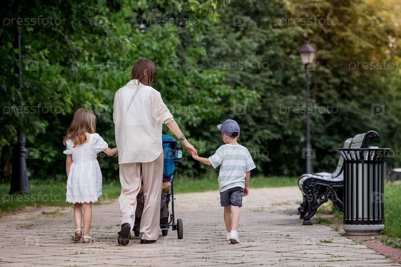 Семья с тремя детьми. Мать с большим количеством детей и малышей в летнем парке. Дети гуляют на свежем воздухе. Многодетность и семейные ценности