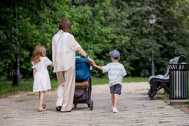 Семья с тремя детьми. Мать с большим количеством детей и малышей в летнем парке. Дети гуляют на свежем воздухе. Многодетность и семейные ценности