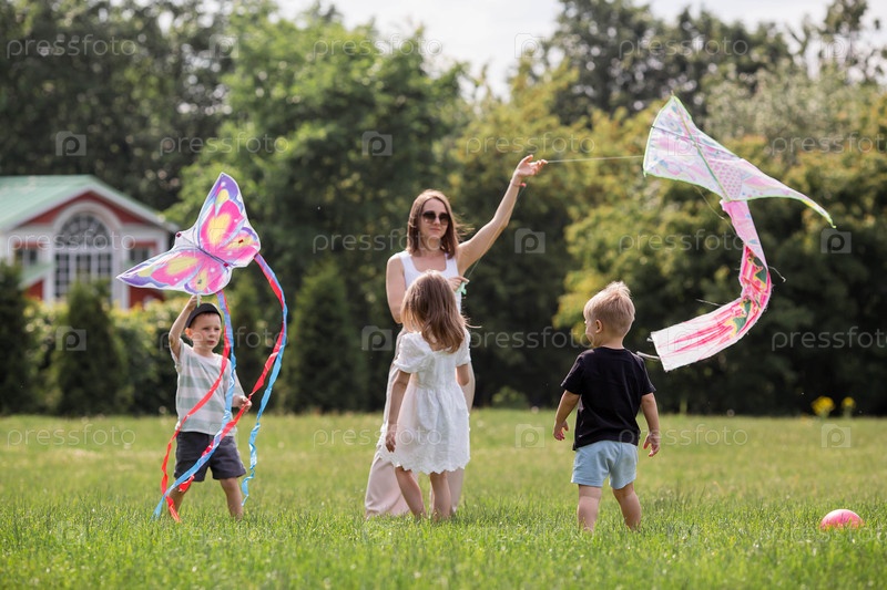 Семья с тремя детьми. Мать с большим количеством детей и малышей в летнем парке. Дети гуляют и летают на змее. Многодетные семьи, семейные ценности, досуг с детьми