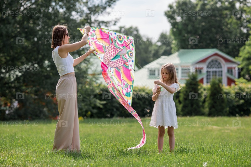 Дети в летнем парке. Красивая девушка и ее мать летают на воздушном змее. Теплые семейные моменты или концептуальный образ для проведения времени на открытом воздухе