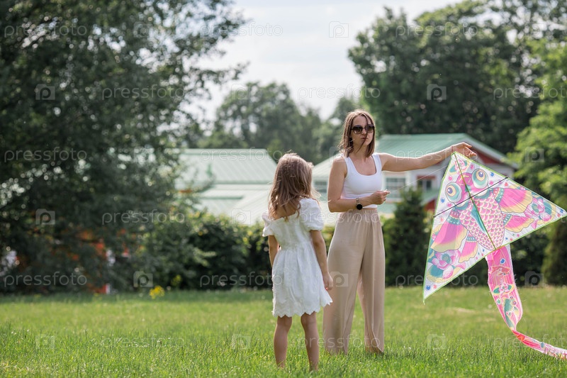 Дети в летнем парке. Красивая девушка и ее мать летают на воздушном змее. Теплые семейные моменты или концептуальный образ для проведения времени на открытом воздухе