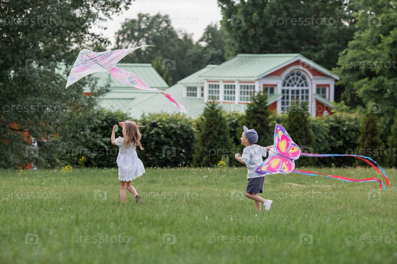 Дети в летнем парке. Дети гуляют и летают на воздушном змее. Теплые семейные моменты или концептуальный образ для проведения времени на открытом воздухе