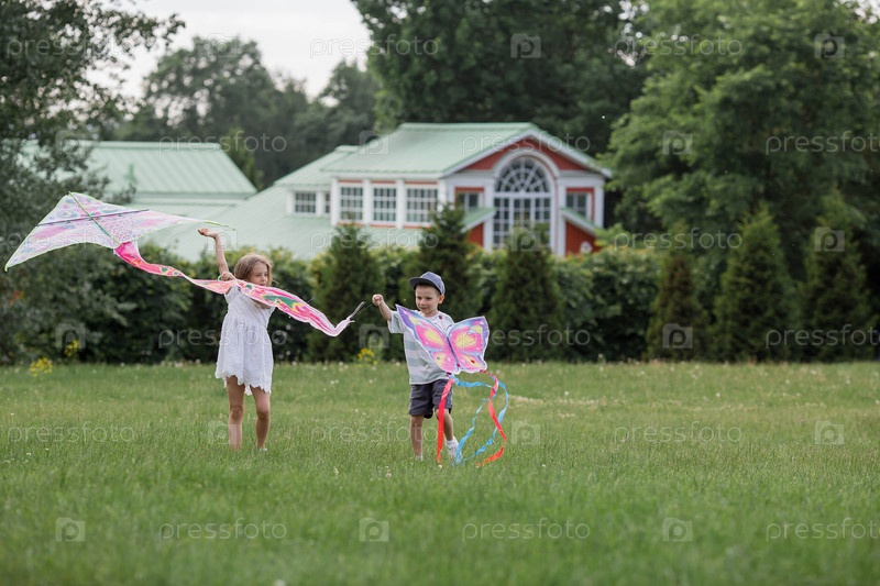 Дети в летнем парке. Дети гуляют и летают на воздушном змее. Теплые семейные моменты или концептуальный образ для проведения времени на открытом воздухе