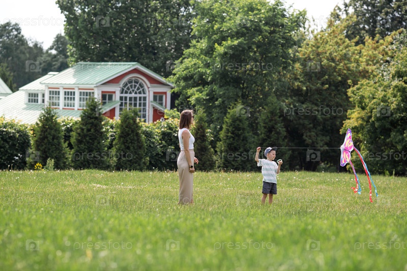 Дети в летнем парке. Маленький мальчик и его мать летают на воздушном змее. Теплые семейные моменты или концептуальный образ для проведения времени на открытом воздухе