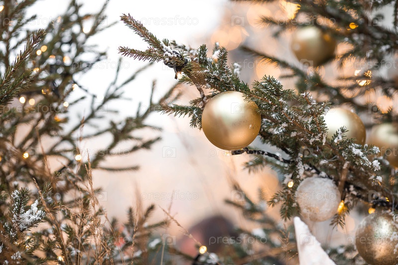 Праздничные игрушки на елке на улицах Москвы. Новогодняя открытка 2026. Прекрасный рождественский фон. Концепция подготовки декораций и декораций к новому году