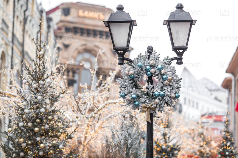 Праздничные игрушки на елке на улицах Москвы. Новогодняя открытка 2026. Прекрасный рождественский фон. Концепция подготовки декораций и декораций к новому году