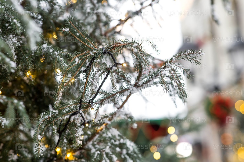 Праздничные игрушки на елке на улицах Москвы. Новогодняя открытка 2026. Прекрасный рождественский фон. Концепция подготовки декораций и декораций к новому году