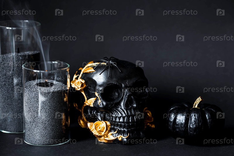 Страшный черный череп с золотыми розами, тыквами и свечами на Хэллоуин или День мертвых на черном фоне