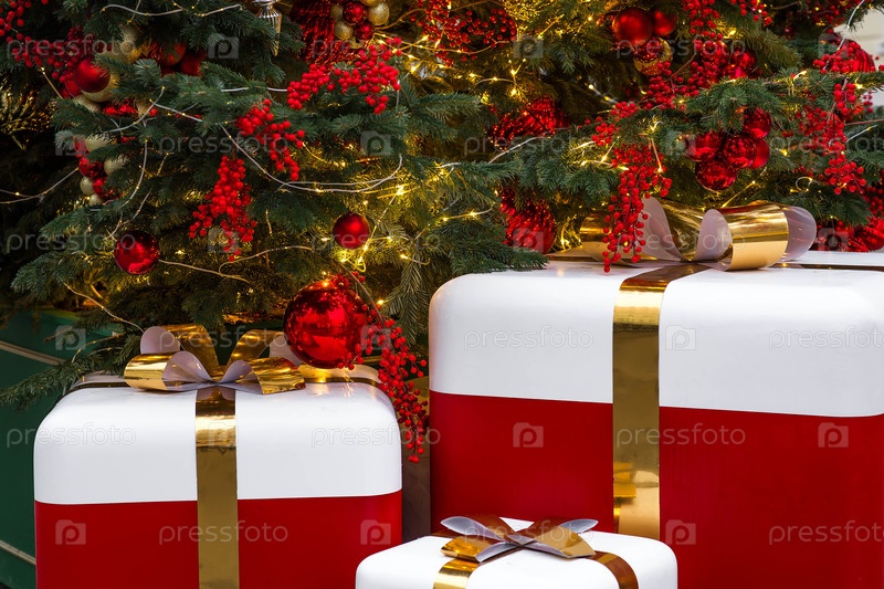 Невероятный рождественский фон. Праздничные игрушки и подарочные коробки на новогодней елке в Москве. Концепция декораций к празднику. Новогодняя открытка 2026
