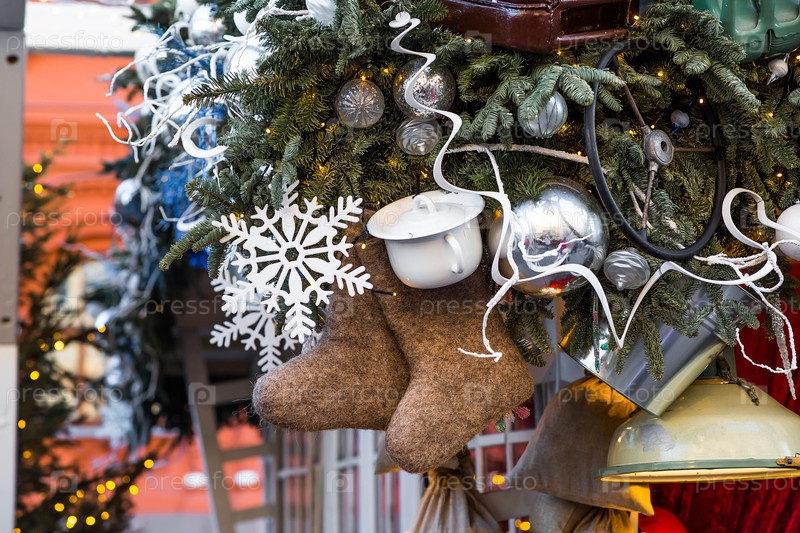 Праздничные игрушки на елке на улицах Москвы. Новогодняя открытка 2026. Прекрасный рождественский фон. Концепция подготовки декораций и декораций к новому году