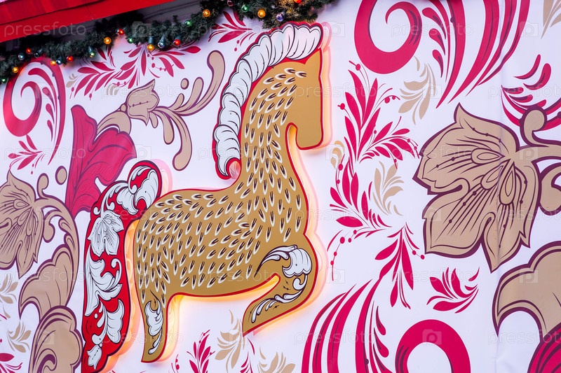 Россия, Москва, 9 января 2025 года. Рождественское украшение улиц. Праздничные пейзажи в городе. Центральный магазин ГУМ на Красной площади. Украшение в стиле Хохломы
