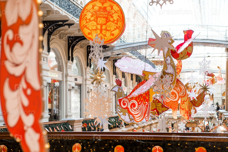 Россия, Москва, 9 января 2025 года. Рождественское украшение улиц. Праздничные пейзажи в городе. Центральный магазин ГУМ на Красной площади. Украшение в стиле Хохломы