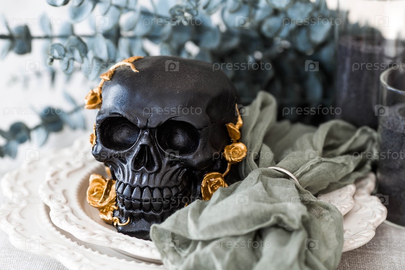 Страшный черный череп с золотыми розами и тыквами на подающих тарелках на Хэллоуин или День мертвых