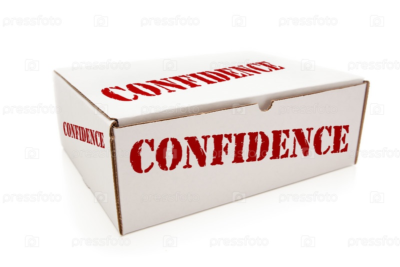 Изолированная белая коробка с надписью УВЕРЕННОСТЬ
