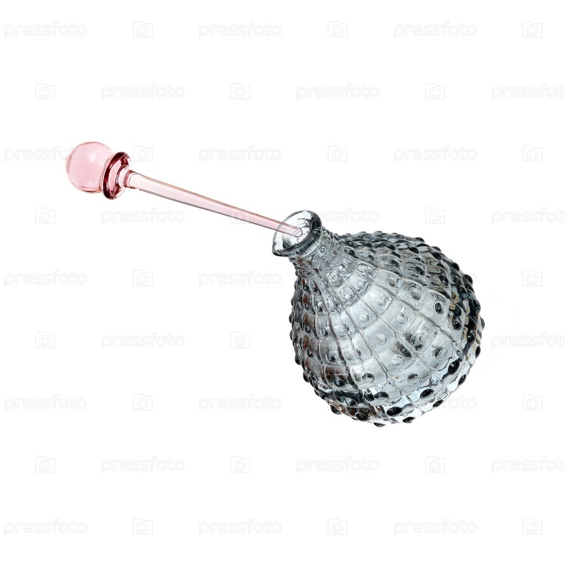 Укладка парфюмерной бутылки со стеклянной пробной палочкой на белом фоне