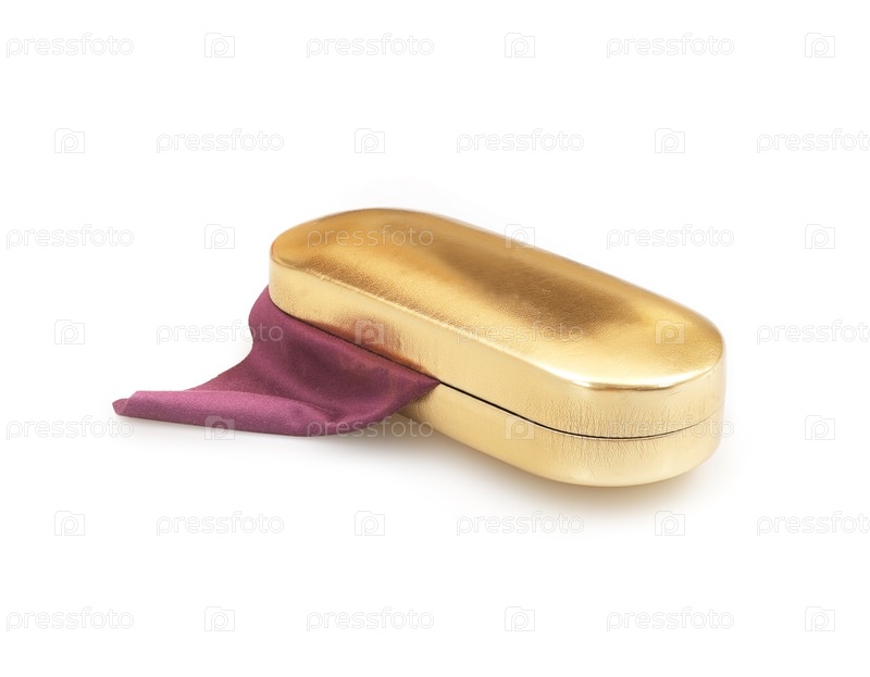 Золотые солнцезащитные очки и футляр для зрелищ изолированы на белом фоне