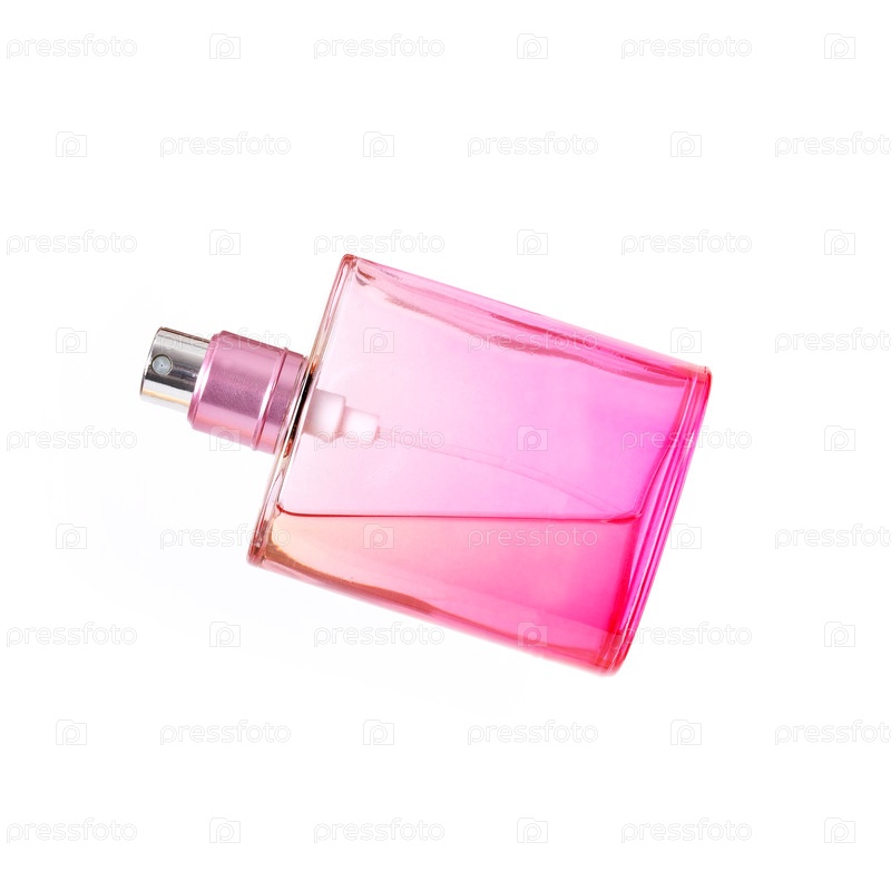 Укладка розовой бутылки духов изолирована на белом фоне
