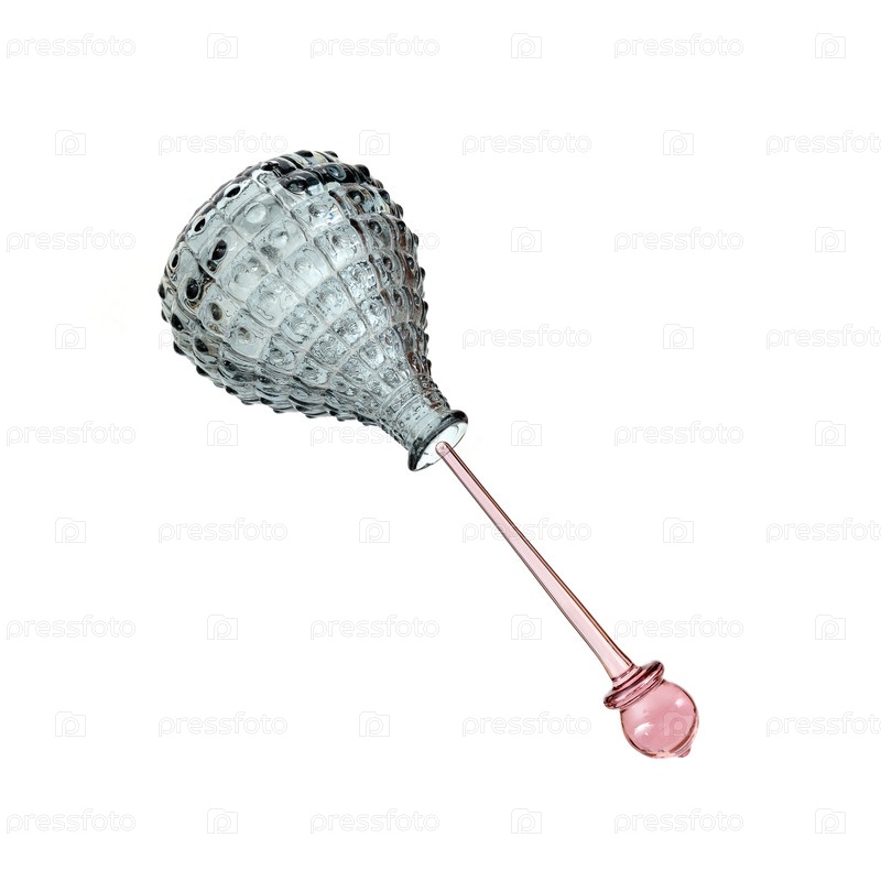 Укладка парфюмерной бутылки со стеклянной пробной палочкой на белом фоне