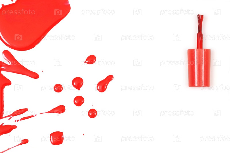 Бутылка с лаком для ногтей упала, лак разлился, лаковые брызги изолированы на белом фоне