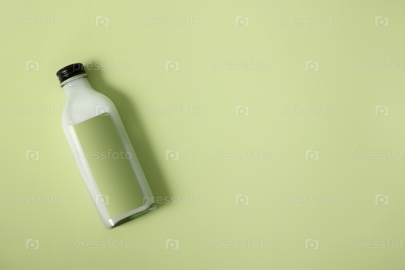 Мокап: стеклянная бутылка с белой жидкостью (молоко, крем, соус), изолированная на цветовом фоне