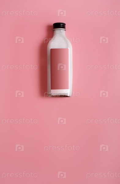 Стеклянная бутылка с белой жидкостью (молоко, сливки, соус) изолирована на розовом фоне