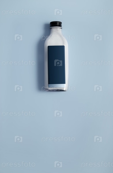 Мокап: стеклянная бутылка с белой жидкостью (молоко, крем, соус), изолированная на цветовом фоне