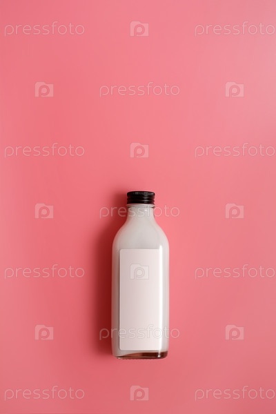 Стеклянная бутылка с белой жидкостью (молоко, сливки, соус) изолирована на розовом фоне