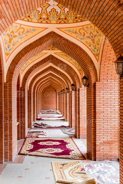 Мусульманская мечеть с коврами и арками красивой восточной архитектуры